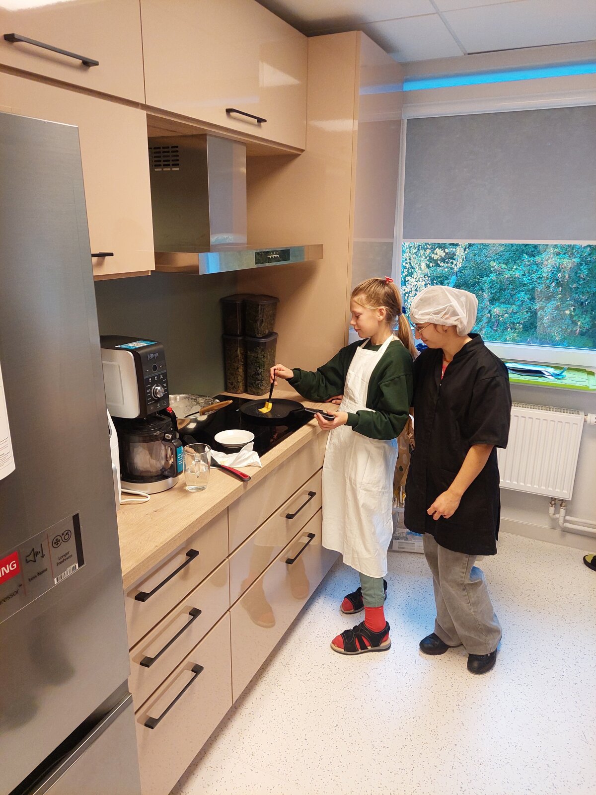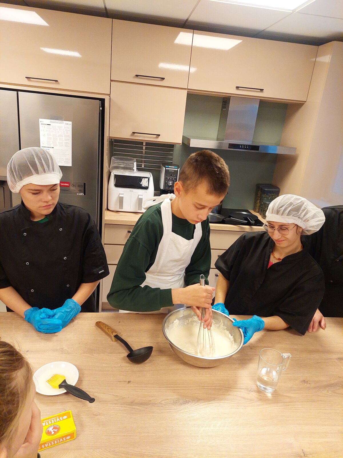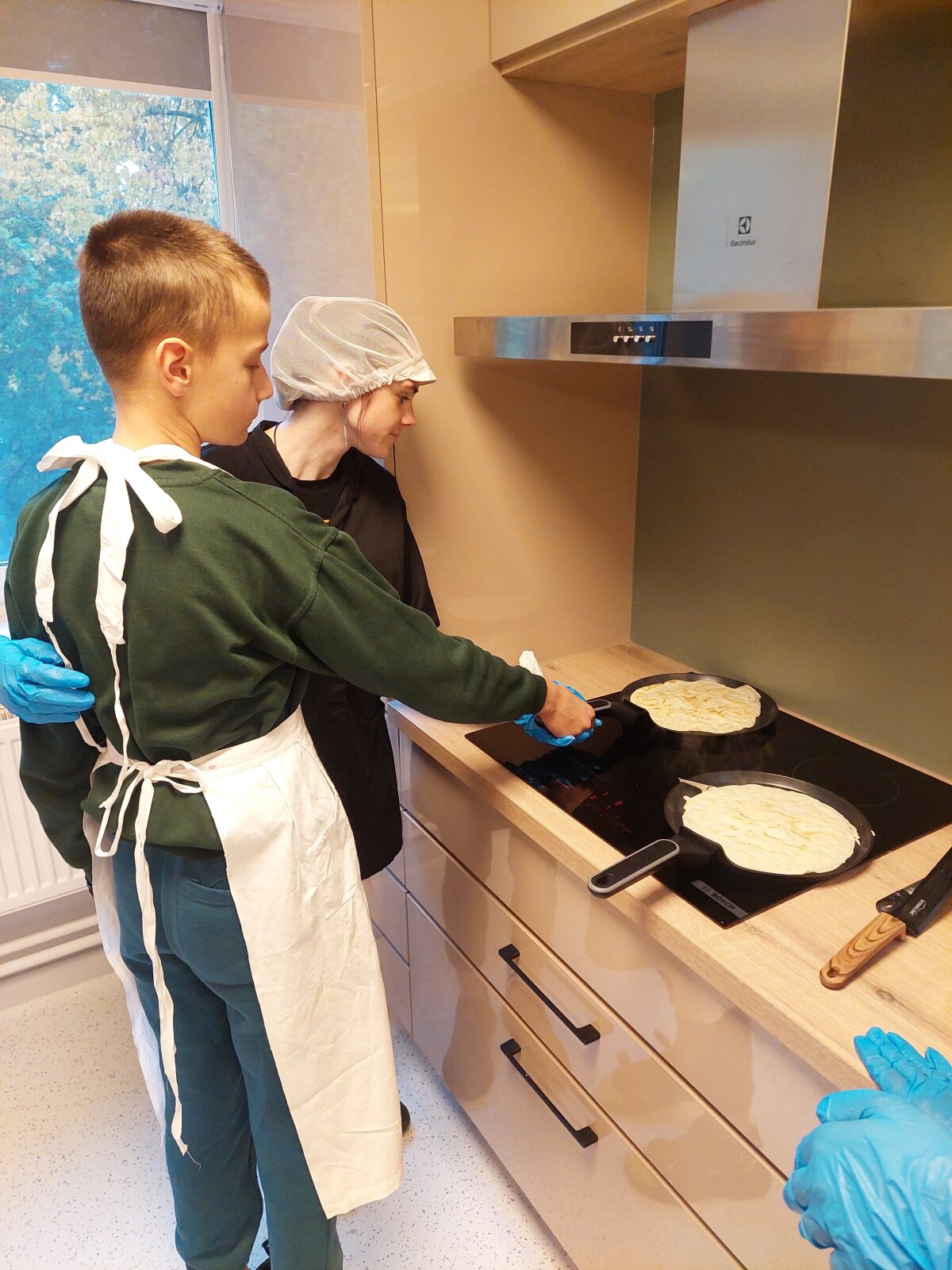 Mitybos kabinete svečiai praktiškai išbandė naujus įrenginius ir įrankius integruotoje praktinėje veikloje tema „Lietiniai blynai“ kartu su 5, 6, l klasės mokiniais, jų mokytoja S. Skirpstiene ir mokinių padėjėja S. Grikiniene. Užsiėmimo metu buvo ne tik demonstruojamas lietinių kepimo procesas, bet ir aktyviai bendradarbiaujama – mokiniai kartu maišė tešlą, įgavo praktinių žinių: kodėl miltus reikia sijoti, kodėl tešlai reikia leisti pastovėti, išbrinkti. Veiklos dalyviai mokėsi teisingai ir saugiai elgtis su įrenginiais. Visi kartu kepė blynus bei juos ragavo.