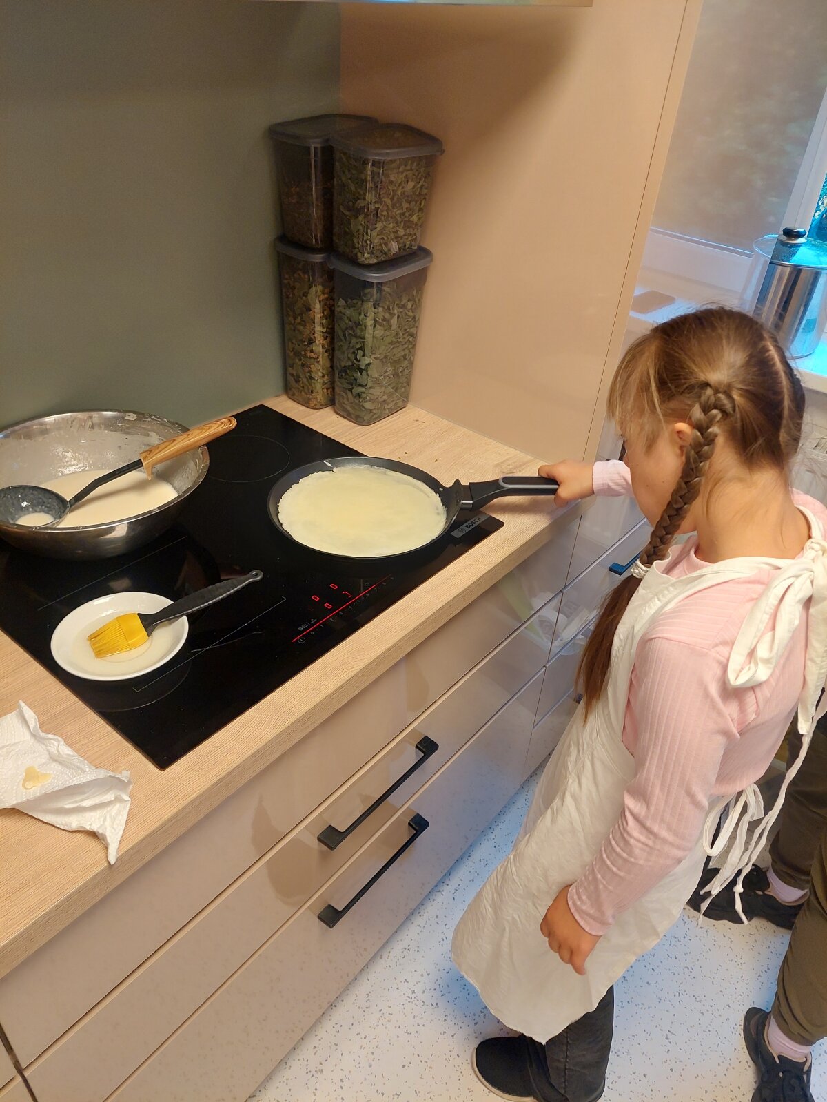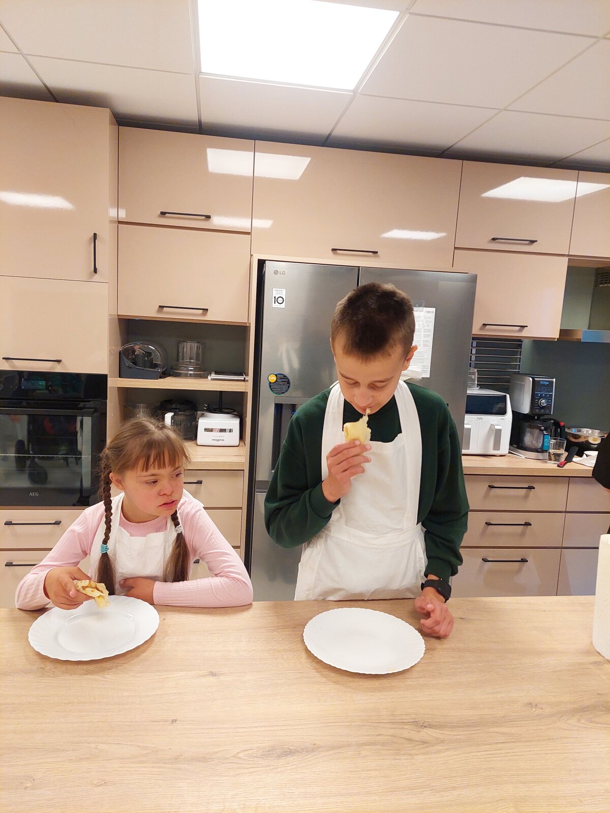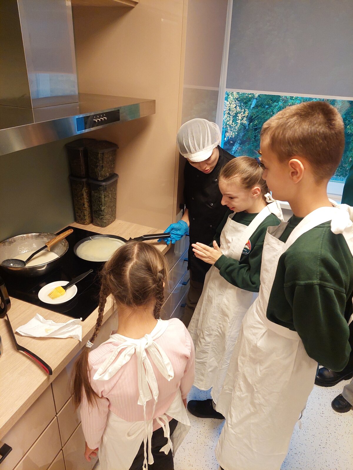 Mitybos kabinete svečiai praktiškai išbandė naujus įrenginius ir įrankius integruotoje praktinėje veikloje tema „Lietiniai blynai“ kartu su 5, 6, l klasės mokiniais, jų mokytoja S. Skirpstiene ir mokinių padėjėja S. Grikiniene. Užsiėmimo metu buvo ne tik demonstruojamas lietinių kepimo procesas, bet ir aktyviai bendradarbiaujama – mokiniai kartu maišė tešlą, įgavo praktinių žinių: kodėl miltus reikia sijoti, kodėl tešlai reikia leisti pastovėti, išbrinkti. Veiklos dalyviai mokėsi teisingai ir saugiai elgtis su įrenginiais. Visi kartu kepė blynus bei juos ragavo.