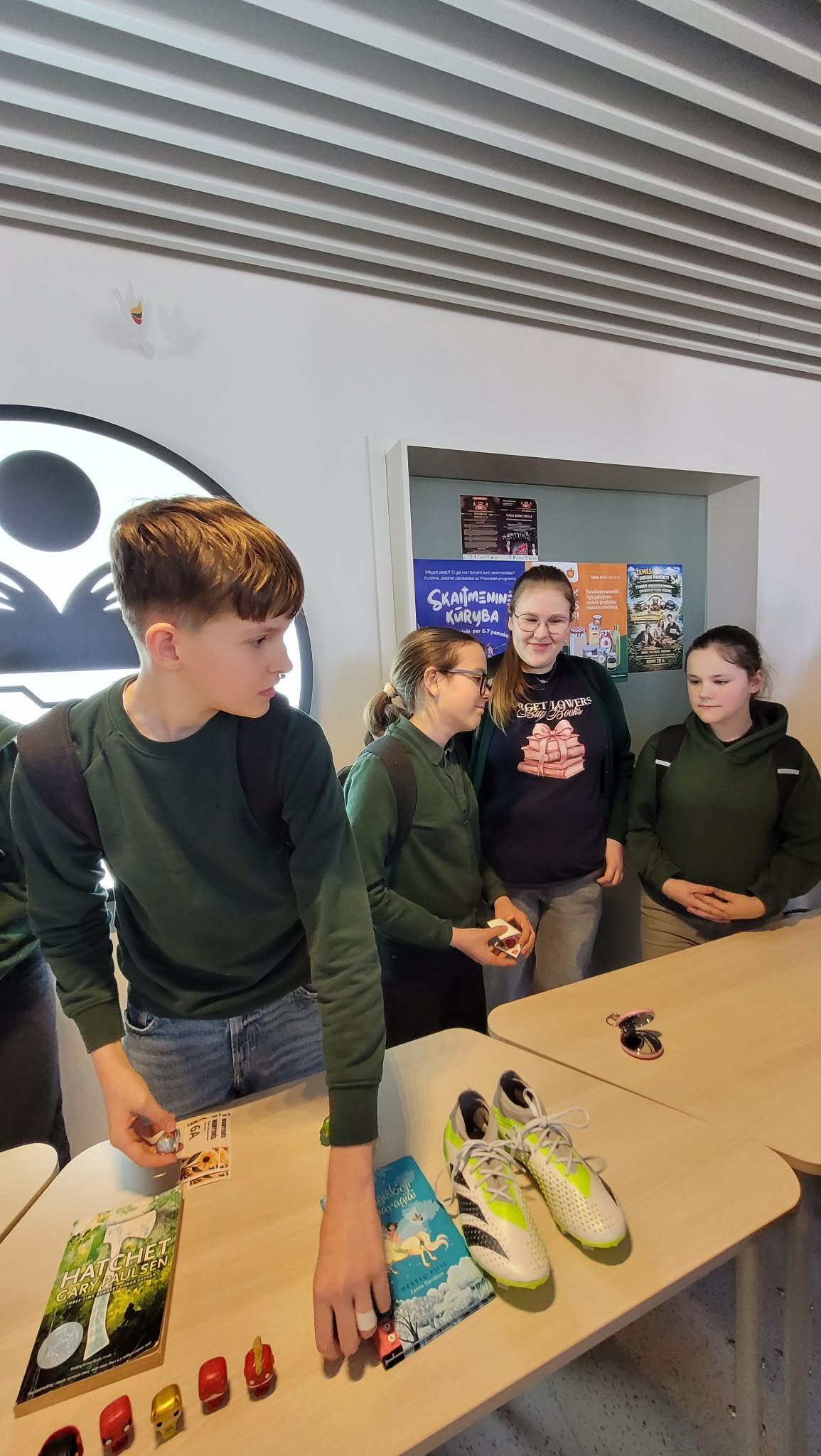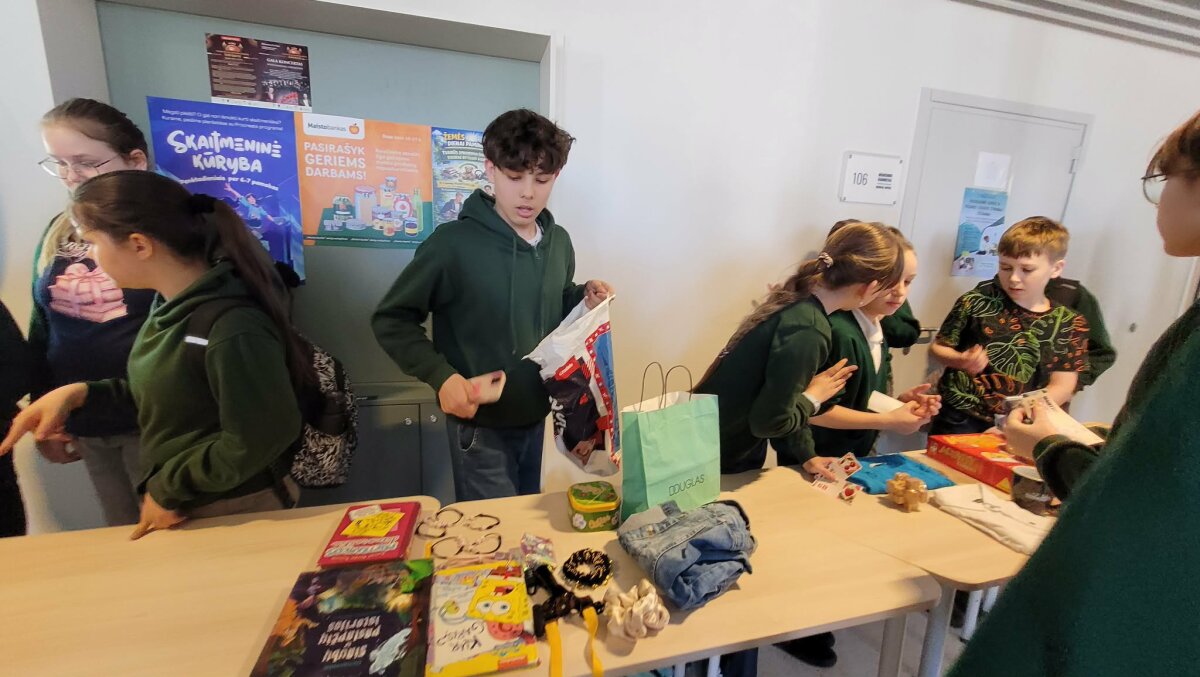 Gimnazijos fojė virto gyva daiktų mainytuvių erdve.Užuot pirkę naujus daiktus, mokiniai vieni kitiems siūlė tai, kas jų namuose tiesiog dulkėjo lentynose: perskaitytos knygas, nebenaudojami aksesuarai, žaidimai ar net stilingi drabužiai.